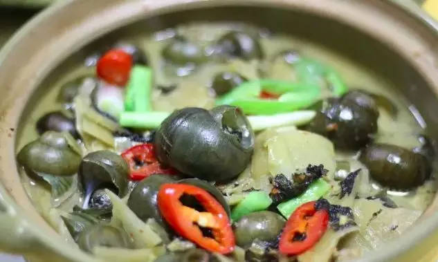 万事俱备,正式开启烹饪之旅。热锅凉油,待油烧至七成热,放入葱姜蒜、辣椒等香料,小火煸炒至香气四溢,瞬间激活厨房的空气。接着,倒入处理好的田螺,转大火爆炒,让田螺充分吸收香料的味道。随后加入酸笋,持续翻炒均匀。此时,依次放入适量生抽、老抽、蚝油、盐、糖等调味料,再加入足量清水,没过食材,大火烧开后转小火慢炖。为使味道更浓郁,可倒入砂锅中,小火慢煲半小时左右,让田螺、酸笋与汤汁完美融合,彼此渗透,将美味发挥到极致。出锅前,撒上一把葱花或香菜点缀,色香味俱全的酸笋田螺煲闪亮登场。